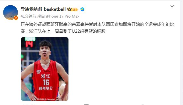 如今根据媒体人导演我躺哪_basketball报道:“正在海外征战西班牙联赛的余嘉豪将暂时离队回国参加即将开始的全运会成年组比赛,浙江队在上一届拿到U22组男篮的铜牌。”